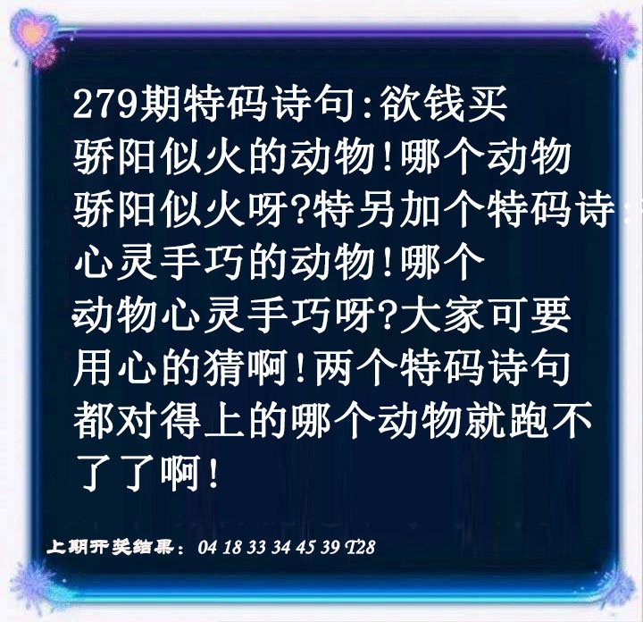 279期:【欲钱解特诗句】开?00(中) 羊鸡猴鼠发大财,本期特码出大数 |