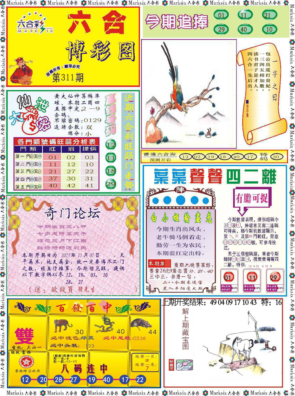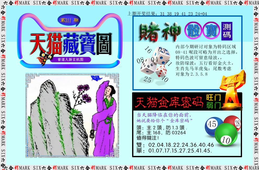 | 第311期 | 主:鼠狗马 防:鸡猪羊虎 | 开?00 |