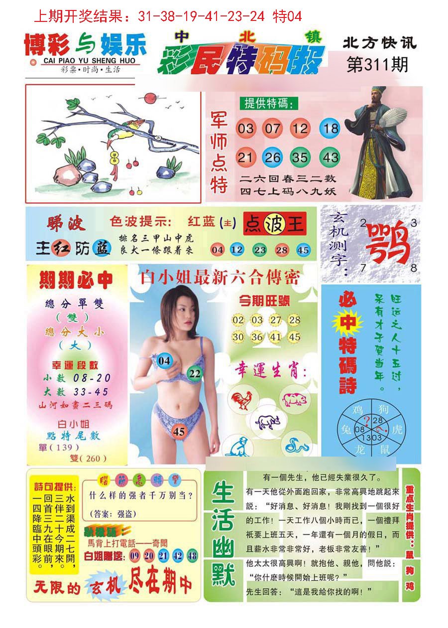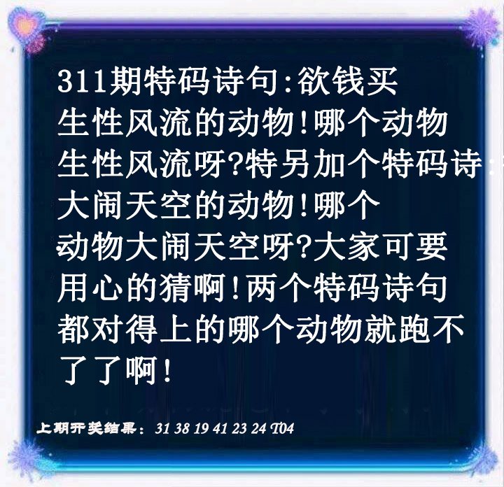 311期:【欲钱解特诗句】开?00(中) 狗鸡猴虎发大财,本期特码出大数 |