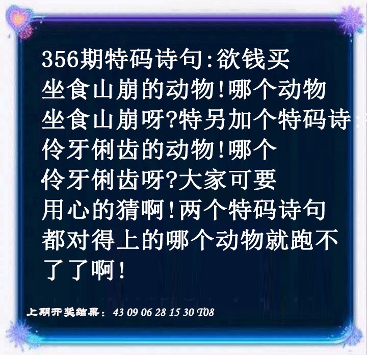 356期:【欲钱解特诗句】开?00(中) 鼠鸡马狗发大财,本期特码出大数 |